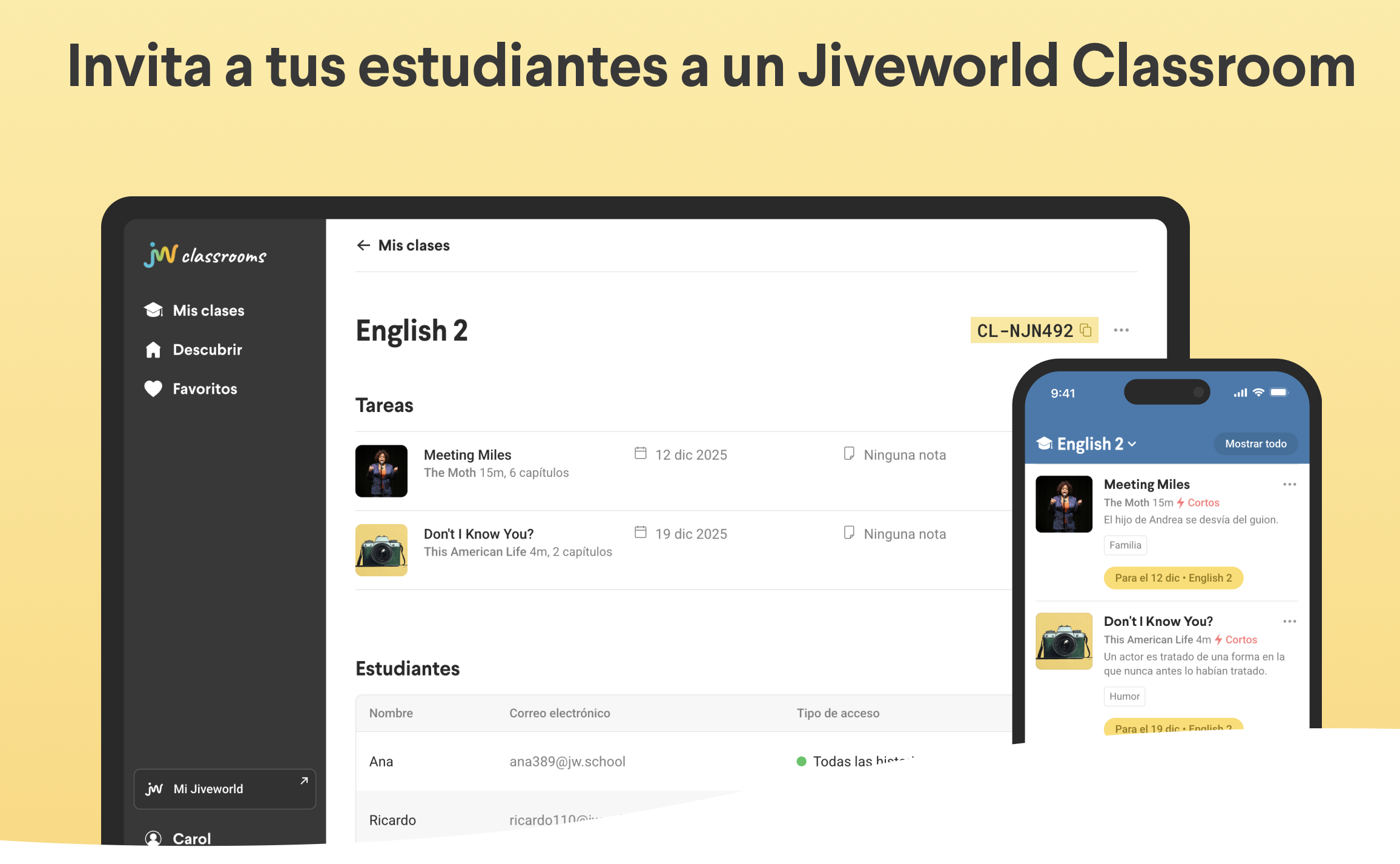A través del Portal de Jiveworld Classrooms, puedes asignar historias a tus estudiantes y monitorear su progreso. Los alumnos en aulas con licencia premium tendrán acceso completo a nuestro catálogo, para que puedan estudiar en casa y prepararse para las discusiones en clase. Incluso puedes crear tareas específicas con plazos de entrega para que sean completadas por tus estudiantes.
